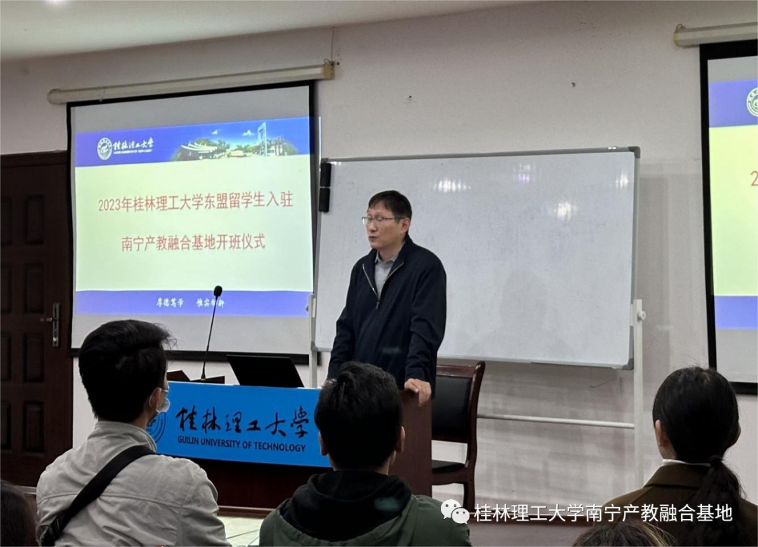 基地主任胡振光教授在开班仪式上做重要讲话。他首先对此次到达的所有东盟留学生们表示欢迎和祝贺,强调了本次“东盟留学生入驻南宁产教融合基地”的重要性和意义。他指出,基地是学校、产业、企业的平台窗口,留学生是学校国际化战略的重要组成部分,也是促进中外文化交流的重要桥梁。他强调,学校和基地十分重视本次交流,基地为此次交流做了不少准备,基地将安排留学生们前往民族博物馆、左江花山岩画等地进行实地参观,同时安排相关老师进行课堂教学。他希望留学生们能够充分利用此次机会,努力学习,深入了解中华文化和社会,为自己的未来发展打下坚实的基础。同时也鼓励各位留学生能参与到基地的产研项目中来。