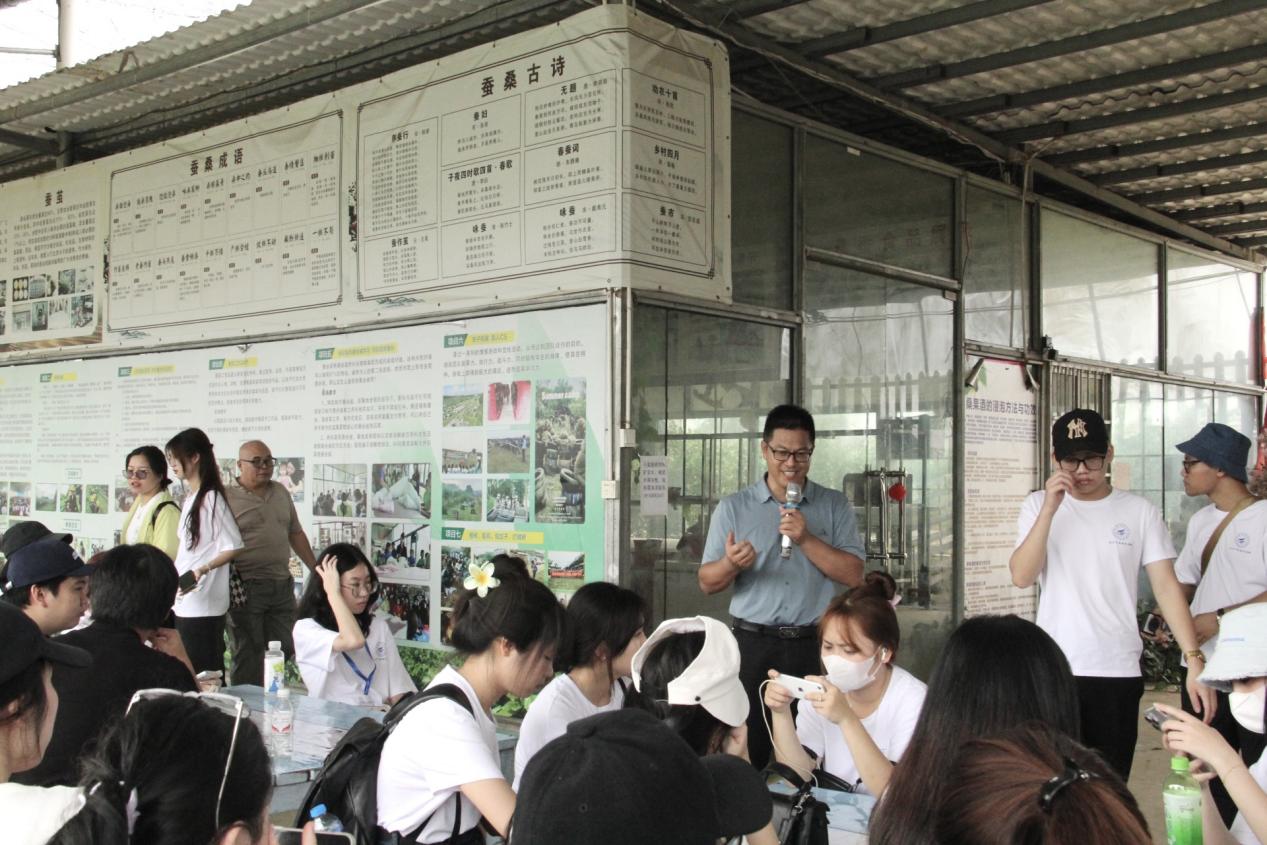 (八桂丝源桑果园余武昌给留学生们介绍桑叶与蚕)