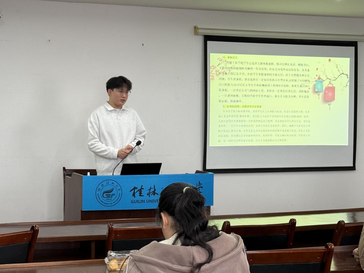 1月14日,为了进一步加强学生安全意识,确保每位同学能够度过一个平安、愉快的寒假,南宁产教融合基地在3号楼1011召开研究生寒假安全教育主题班会。