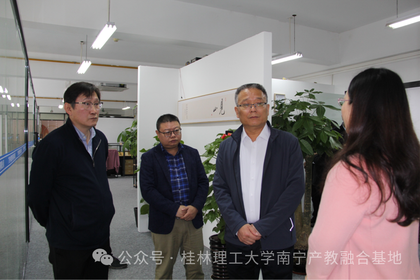 基地主任胡振光热情介绍了基地内的企业——中贸教育在基地的发展以及与基地园区的合作项目。接着带着王敦球校长和王磊副校长参观了基地的培训、研究生办公场所及学生公寓。